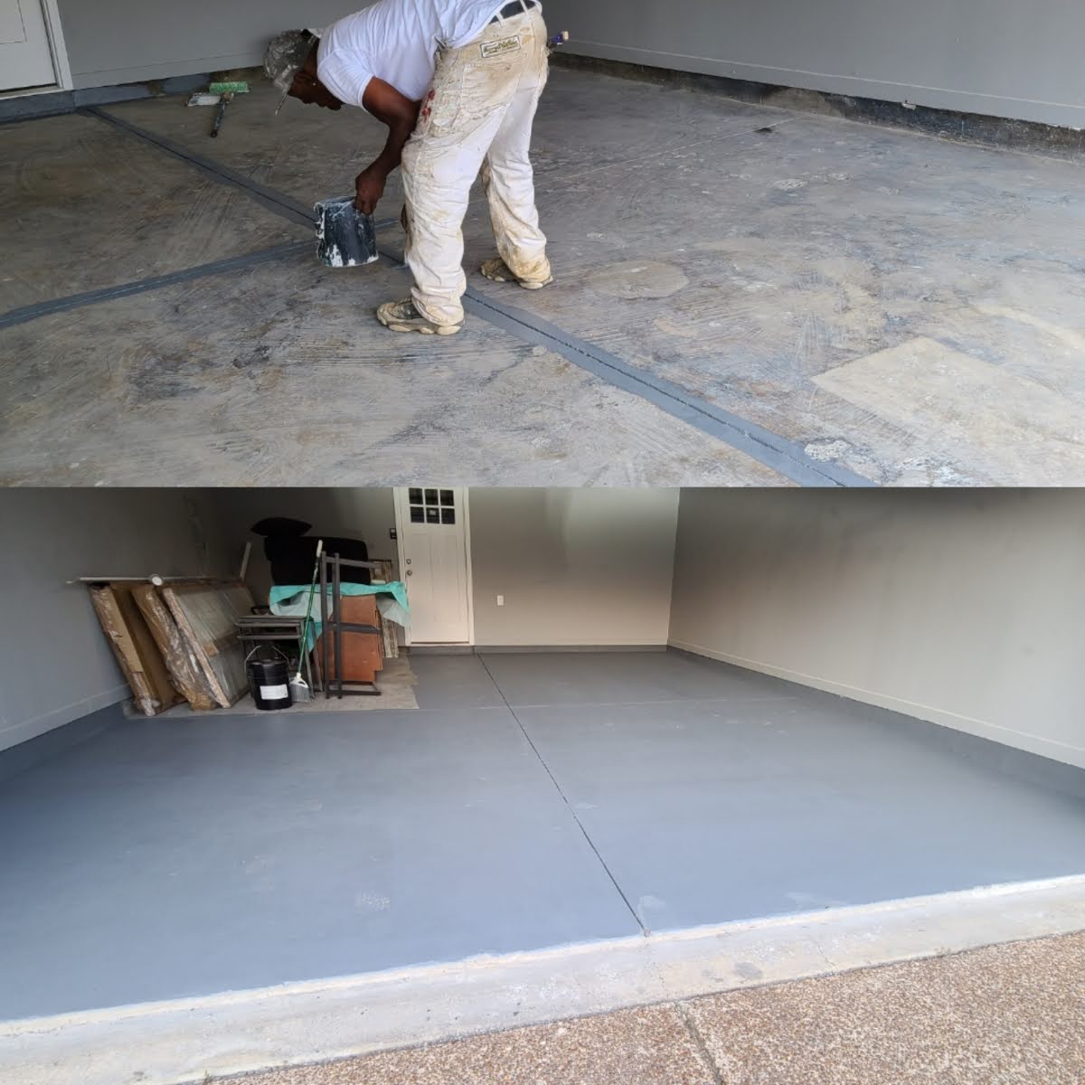 Anti-slip paint for concrete floors, carports, driveways, and patios. Exterior/interior concrete floor paint, no-slip, anti-skid, available in grey and black.