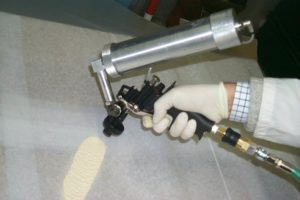 Professional gun for spraying and extrusion of sealant products, soundproofing and protective materials (single component). The gun is designed to accept both plastic and aluminum cartridges. The gun is hermetically sealed which avoids hardening of the product when not in use.